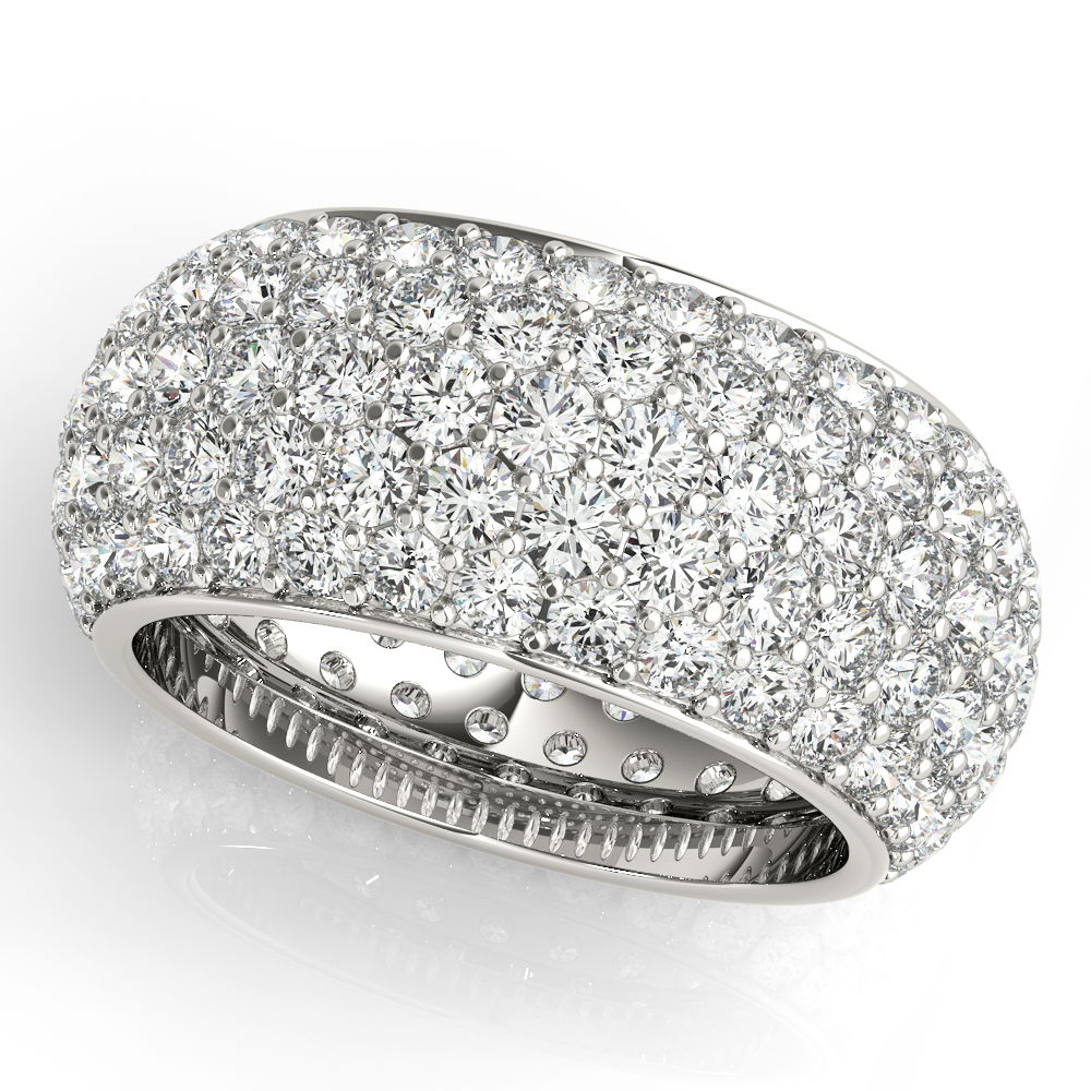 Wyrazisty pierścionek typu statement o szerokiej, kopułowej formie w całości pokrytej diamentami w oprawie pavé. Rzędy okrągłych naturalnych diamentów tworzą gęstą, świetlistą powierzchnię, która przyciąga spojrzenia z każdej strony. Wykonany z 18K białego złota, pierścionek wyróżnia się odważnym designem i eleganckim wykończeniem.